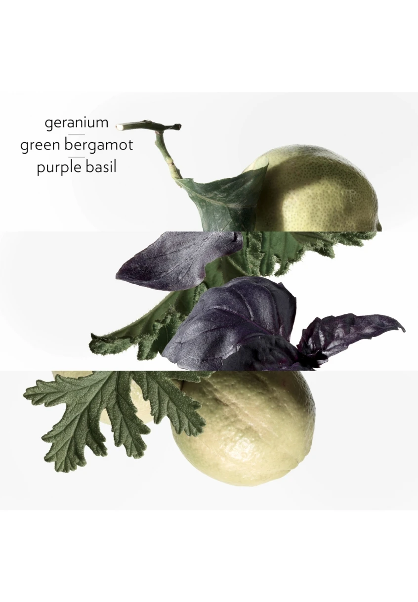 Eau de basilic pourpre, c’est la fraîcheur aromatique d’un basilic pourpre, profond et généreux, vivifié par une bergamote verte, légère et cristalline, et par un géranium qui lui donne son caractère.